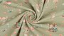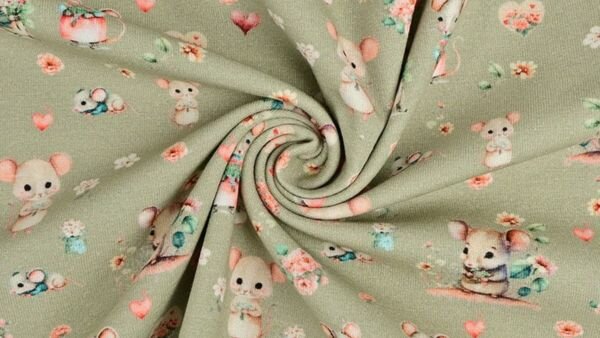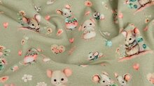 De combinatie van een rustige groene ondergrond en een speelse muizenprint maakt deze stof geliefd voor: