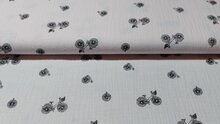 Lichtroze mousseline met zwarte fietsen, 100% katoen. Luchtige stof voor kleding en accessoires.