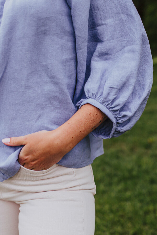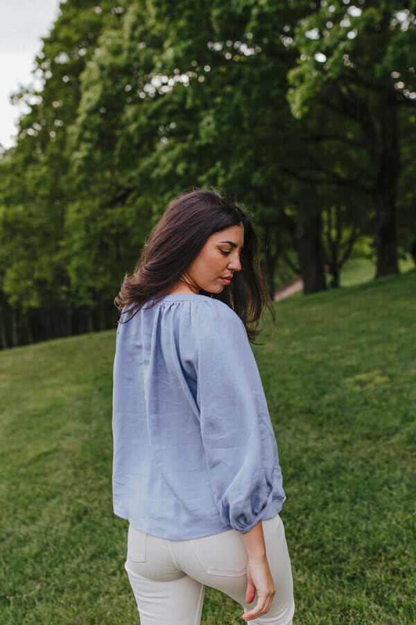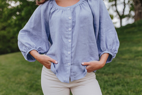 Ontdek de romantische Amalfi blouse! Perfect voor naaiers die houden van pofmouwen, knopen en creatieve mogelijkheden.