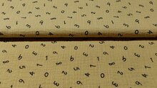 Okergele mousseline met getallen, 100% katoen. Speelse en luchtige stof voor creatieve projecten.