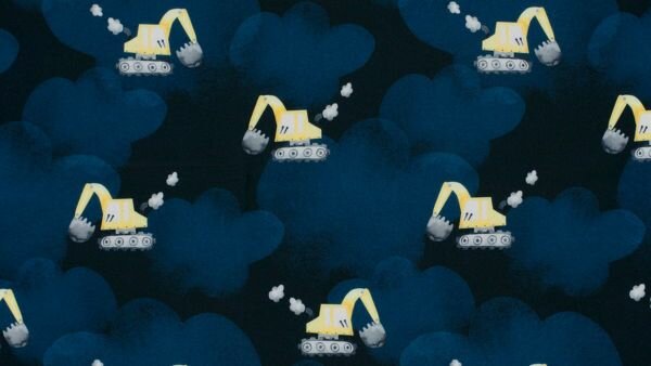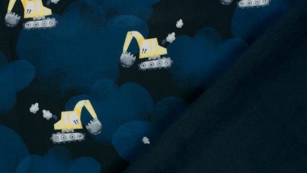 Deze stoere softshell stof met graafmachines op een marineblauwe achtergrond is perfect voor kinderkleding. Of je nu een jasje, regenbroek of buitenspeelpakje wilt maken, met deze stof zit je altijd goed. De vrolijke print met graafmachines maakt elk kledingstuk uniek en leuk om te dragen voor kinderen die dol zijn op voertuigen.