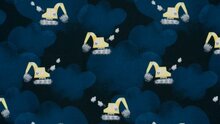 Stevige softshell stof met graafmachines op marineblauw. Perfect voor jasjes of buitenspeelgoed. Waterafstotend en ademend.